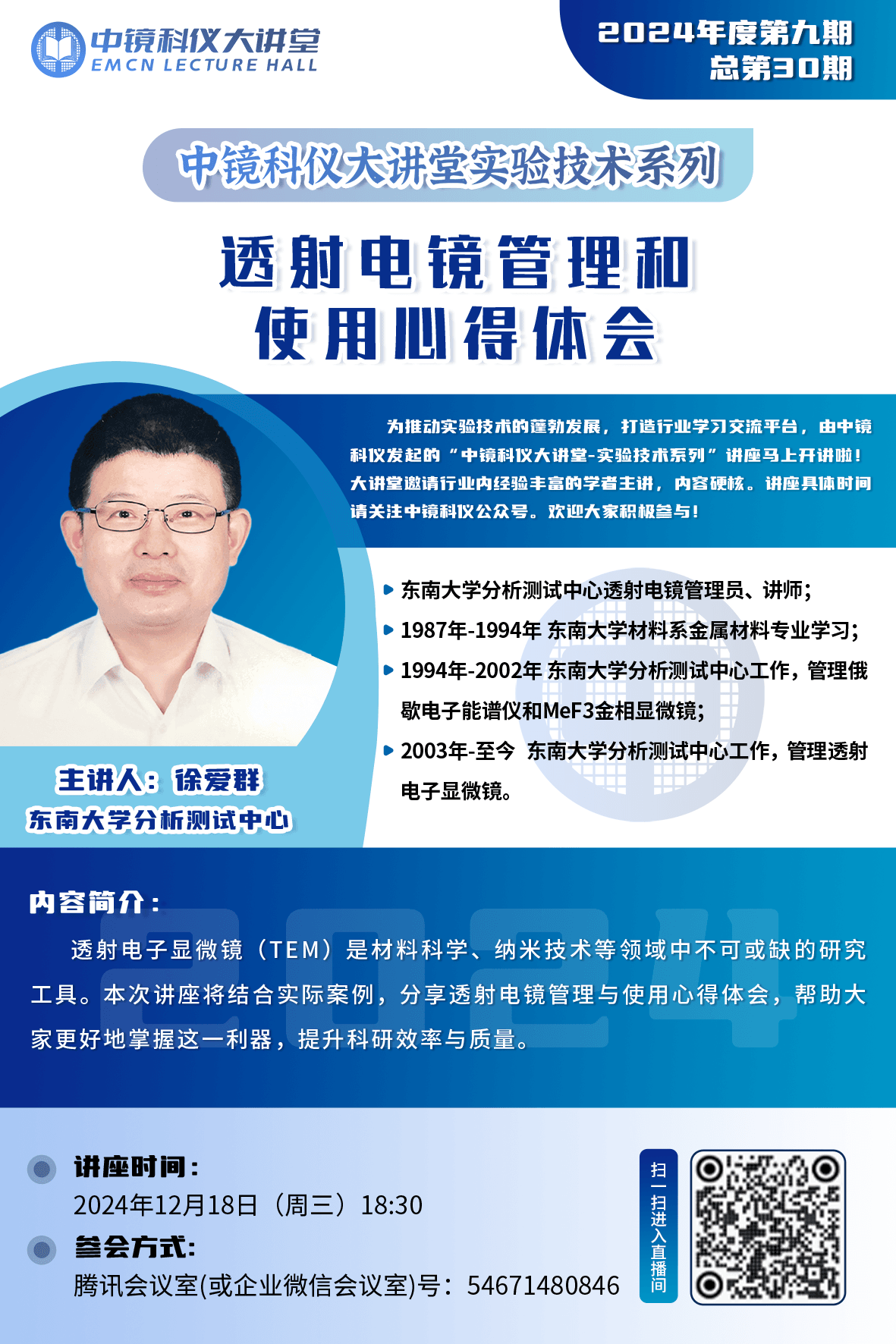 2024年“中鏡科儀大講堂”第九期-“實驗技術系列”講座將于2024年12月18日18:30開講。本期由東南大學分析測試中心透射電鏡管理員徐愛群講師帶來的《透射電鏡管理和使用心得體會》專題講座將詳細介紹透射電鏡常用的數學概念、晶體學基本知識與電子衍射的關系等內容,分享透射電鏡的管理和使用心得。歡迎大家積極參與,共同推動實驗技術的發展! 講座時間: 2024年12月18日(周三)18:30 參會方式: 騰訊會議室(或企業微信會議室)號:54671480846 掃碼進入微信視頻號 掃碼關注中鏡科儀