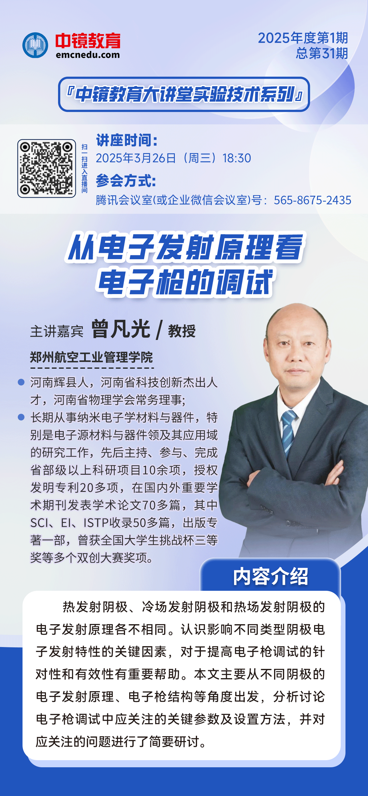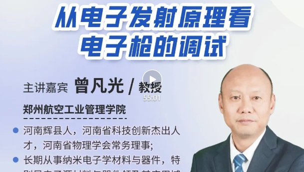 講座回放 中鏡教育大講堂-實驗技術系列 2025年第1期(總第31期) 從電子發射原理看電子槍的調試 為推動實驗技術的蓬勃發展,打造行業學習交流的平臺,由中鏡教育發起的2025年“中鏡教育大講堂”第一期-“實驗技術系列”講座圓滿結束! 熱發射陰極、冷場發射陰極和熱場發射陰極的電子發射原理各不相同。認識影響不同類型陰極電子發射特性的關鍵因素,對于提高電子槍調試的針對性和有效性有重要幫助。本期特邀曾凡光教授為我們帶來了《從電子發射原理看電子槍的調試》的專題講座。講座主要從不同陰極的電子發射原理、電子槍結構等角度出發,分析討論電子槍調試中應關注的關鍵參數及設置方法。內容詳實,深入淺出,精彩非凡! 現將本期講座回放發布,供大家學習,歡迎大家觀看! 講座回放