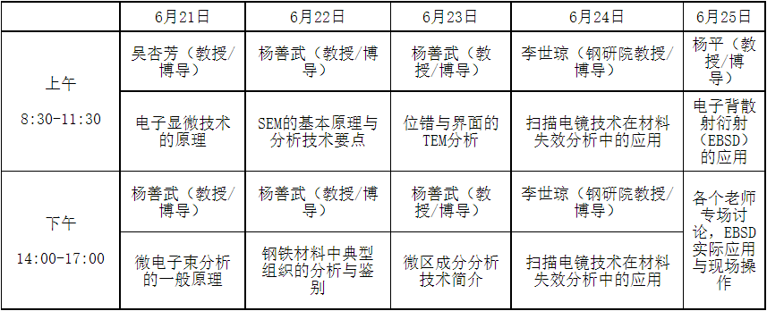 關于舉辦電鏡技術及應用培訓班的通知 ——北京科技大學材料分析測試系列培訓 主辦:北京科技大學、北京材料分析測試服務聯(lián)盟 承辦:北京科技大學分析檢驗中心、北京科技大學材料學院實驗中心 培訓時間:2010年6月21日-6月25日 培訓地點:北京科技大學 培訓專家組成員: 吳杏芳 教授、博士生導師,享受國務院的政府特殊津貼; 李世瓊 鋼鐵研究總院教授、博士生導師; 楊 平 教授、博士生導師,中國體視學學會材料科學分會秘書長; 楊善武 教授、博士生導師; 培訓目的: 本次培訓采取理論與實踐相結合的教學方式,系統(tǒng)介紹電子衍射及成像、電子顯微技術基本概念、原理和發(fā)展歷史,講解掃描電鏡技術及應用,全面講解電鏡技術在材料科學與工程實際中的應用,并通過參觀實習,使學員更加直觀、深刻的掌握電鏡技術。培訓后頒發(fā)培訓證書。 培訓日程安排: 培訓費用:1500元/人; 報名及聯(lián)系方式: 薛潤東 電話:62333470 E-mail:xrd@ustb.edu.cn 劉亞東 電話:62340208 E-mail:lyd@ustbtest.com 地 址:北京科技大學材料測試樓401室 北京科技大學分析檢驗中心