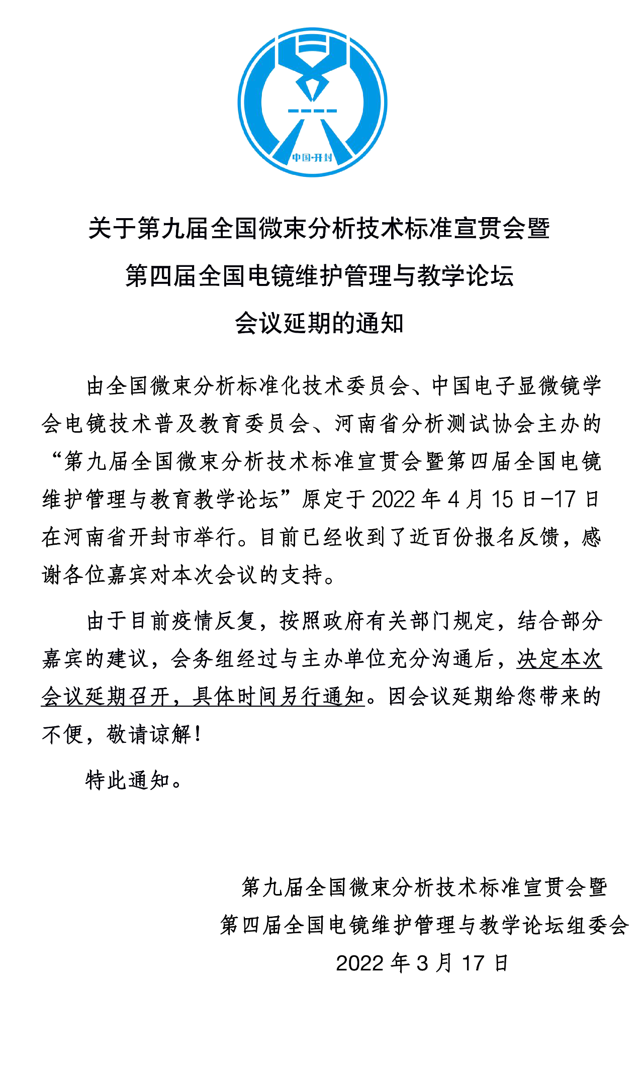 【延期通知】關(guān)于第九屆微束分析標(biāo)準(zhǔn)宣貫會(huì)暨第四屆全國電鏡維護(hù)管理與教學(xué)論壇會(huì)議延期的通知