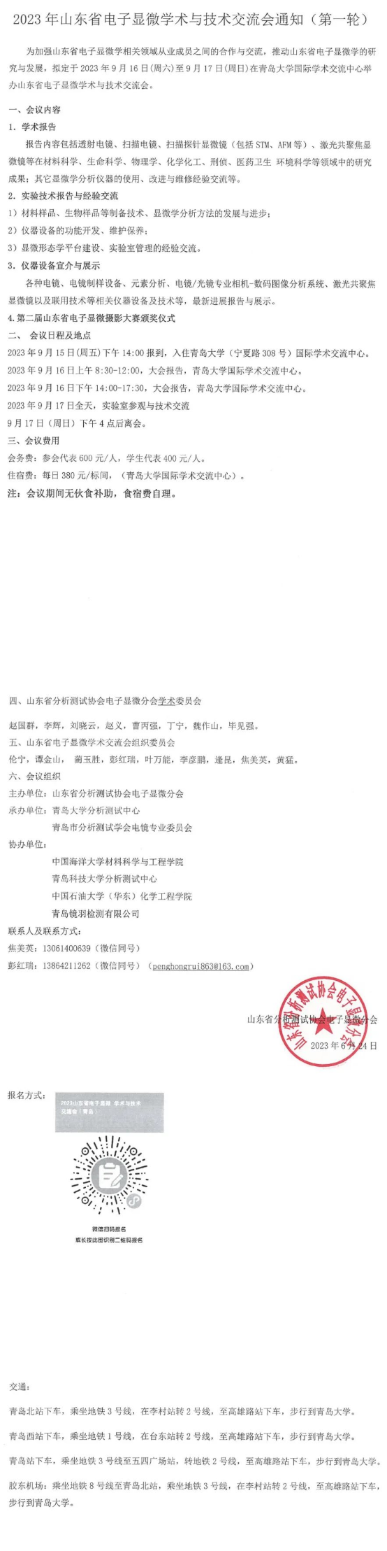 【行業會議】2023年山東省電子顯微學術與技術交流會通知(第一輪)