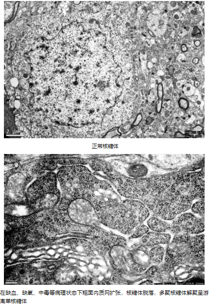 一、細胞的超微結構簡介 細胞的超微結構是指在光學顯微鏡無法觀察到的微觀層面上的細胞結構,主要有“細胞膜、線粒體、內(nèi)質(zhì)網(wǎng)、核糖體、糖原、高爾基復合體、溶酶體、中心體、細胞核、細胞骨架”等。這些超微結構在細胞代謝、運輸和信號傳導等過程能中起著重要作用。 二、常見的細胞超微結構 1、細胞的超微結構——細胞膜 細胞膜的超微結構組成主要包括磷脂雙分子層、膜蛋白和糖脂。磷脂雙分子層是細胞膜最基本的結構,它由兩層磷脂分子組成,每層磷脂分子的疏水性頭部朝向內(nèi)部,親水性尾部朝向外部。這種結構使得細胞膜具有了半透性,可以選擇性地通過一些物質(zhì),從而阻止其他物質(zhì)的進出。 2、細胞的超微結構——線粒體 線粒體是一種存在于大多數(shù)細胞中的由兩層膜包被的細胞器,外膜包繞線粒體,內(nèi)膜向內(nèi)腔反復折疊形成線粒體嵴。它既是細胞中制造能量的結構,又是細胞進行有氧呼吸的主要場所,被稱為“power house”。其直徑在0.5—1.0μm左右。 線粒體的化學組分主要包括水、蛋白質(zhì)和脂質(zhì),此外還含有核酸、少量的輔酶等小分子。 3、細胞的超微結構——內(nèi)質(zhì)網(wǎng) 內(nèi)質(zhì)網(wǎng)是由一層單位膜所形成的囊狀、泡狀和管狀結構,并形成一個連續(xù)的網(wǎng)膜系統(tǒng),是細胞中的重要細胞器。由于它靠近細胞質(zhì)的內(nèi)側,故稱為內(nèi)質(zhì)網(wǎng)。其依據(jù)內(nèi)質(zhì)網(wǎng)膜外表面是否有核糖體附著,分為滑面內(nèi)質(zhì)網(wǎng)和粗面內(nèi)質(zhì)網(wǎng)。 滑面內(nèi)質(zhì)網(wǎng)通常由有分支的小管或小泡結構組成,是細胞內(nèi)合成脂類物質(zhì)的重要部位。 粗面內(nèi)質(zhì)網(wǎng)表面有大量核糖體附著,主要功能為合成分泌蛋白,如肽類、酶類及抗體等。 4、細胞的超微結構——核糖體 核糖體是細胞中負責蛋白質(zhì)合成的重要細胞器,它將mRNA上的遺傳信息轉化為具體的蛋白質(zhì)序列,從而實現(xiàn)生物體內(nèi)蛋白質(zhì)的合成和功能發(fā)揮。核糖體形態(tài)為不規(guī)則顆粒狀結構,直徑10-25nm。 6、細胞的超微 糖原(Glycogen)是一種多聚糖,是由葡萄糖分子通過α-1,4-糖苷鍵和一些α-1,6-糖苷鍵連接而成的大分子。糖原合成于細胞質(zhì),是細胞的能源儲存。糖原顆粒可以散在或成堆分布于細胞質(zhì)內(nèi),也偶見于細胞核、線粒體及內(nèi)質(zhì)網(wǎng)等細胞器中 。在電子顯微鏡下觀察,糖原為無被膜包裹的無定型顆粒,α糖原顆粒較大約100nm,呈玫瑰花簇樣結構,而 β糖原顆粒呈圓形較小約40nm,一般認為 α糖原顆粒由 β 糖原顆粒聚集而成。 7、細胞的超微結構——高爾基復合體 高爾基復合體是細胞內(nèi)蛋白質(zhì)合成和糖類加工場所,主要功能為將粗面內(nèi)質(zhì)網(wǎng)合成的蛋白再加工修飾,最后以出芽的方式形成分泌泡,通過胞吐可以運輸?shù)郊毎猓瑓⑴c細胞分泌活動。 8、細胞的超微結構——溶酶體 溶酶體是分解蛋白質(zhì)、核酸、多糖等生物大分子的細胞器,具有水解酶的膜包裹結構,主要負責物質(zhì)的降解和消化,參與消化物質(zhì)、噬菌作用、廢物處理和細胞自噬等重要功能。其通過酸性pH和水解酶的活性,實現(xiàn)對物質(zhì)的分解和清除,維持細胞內(nèi)環(huán)境的穩(wěn)定。根據(jù)內(nèi)含物和形成階段的不同,溶酶體可分為兩大類:①具有均質(zhì)基質(zhì)的顆粒狀溶酶體稱為初級溶酶體(primary lysosome),②含有復雜的髓磷脂樣結構的液泡狀溶酶體稱為次級溶酶體(secondary lysosome)。 9、細胞的超微結構——中心體 中心體(centrosome)是動物細胞中一種重要的細胞器,由中心粒和其他相關成分組成。它在細胞分裂、微管組裝和細胞極性調(diào)控中發(fā)揮重要作用。因其位于細胞核附近的細胞質(zhì)中,接近于細胞的中心,因此叫中心體。在電子顯微鏡下可以看到,每個中心體含有兩個中心粒,這兩個中心粒相互垂直排列。 10、細胞的超微結構——細胞核 細胞核(nucleus)是真核細胞內(nèi)最大、最重要的細胞結構,是細胞遺傳與代謝的調(diào)控中心,是真核細胞區(qū)別于原核細胞最顯著的標志之一(極少數(shù)真核細胞無細胞核,如哺乳動物的成熟的紅細胞,高等植物成熟的篩管細胞等)。它主要由核膜(nuclear membrane)、染色質(zhì)(chromatin)、核仁(nucleolus)、核基質(zhì)(nuclear matrix) 等組成。細胞核是細胞內(nèi)遺傳信息的儲存、復制和轉錄的主要場所。 11、細胞的超微結構——細胞骨架 細胞骨架是胞漿中一組由纖維狀結構組成的網(wǎng)架,包括微管(microtubule,MT)、微絲(microfilament,MF)及中間纖維(intermediate filament, IF),具有支撐和維持細胞形態(tài)及細胞運動的功能。 它所組成的結構體系稱為“ 細胞骨架系統(tǒng)”,與細胞內(nèi)的遺傳系統(tǒng)、生物膜系統(tǒng)、并稱“細胞內(nèi)的三大系統(tǒng)”。 纖毛內(nèi)部有微管和微絲,在電鏡下我們能看到能清楚看到微管的動力臂結構,且對稱排列組合,當微管組合異常和動力臂缺失時會引發(fā)原發(fā)性纖毛不動綜合征 本文部分內(nèi)容摘自《腦腫瘤與神經(jīng)組織電鏡圖譜》編著 孫異臨 人民衛(wèi)生出版社 編寫:裴 霞 制作:李慧芳 審核:王 萍 校對:李鳳麗、趙勝藍、殷 雪