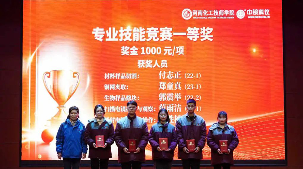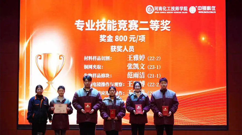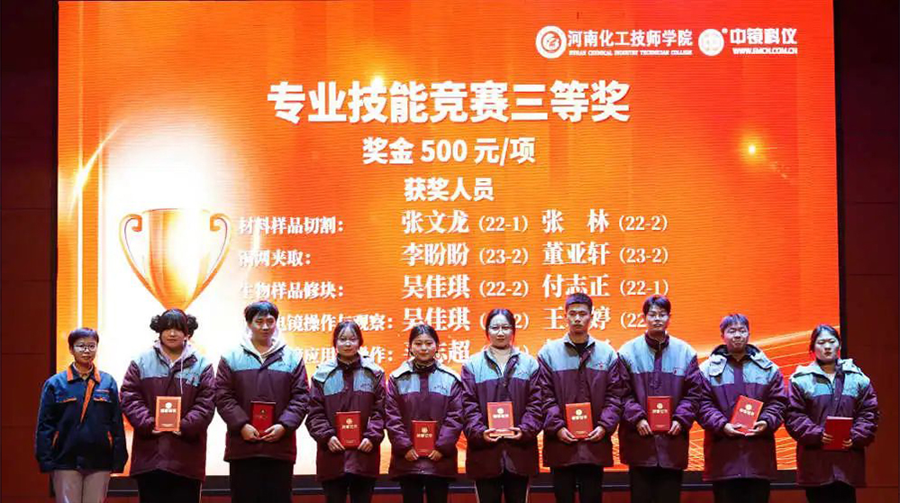中鏡科儀集團 為學(xué)科競賽獲獎學(xué)生頒發(fā)獎金 深化校企合作,助力培育人才 競賽前期,各專業(yè)教研室及任課老師精心組織,認真準備,無論是制定評分標準,準備儀器、試劑和耗材,還是組織學(xué)生選拔考核,每一項工作都一絲不茍,力求做到精益求精。 競賽過程中,裁判老師認真執(zhí)裁,公平公正,選手們專心致志,無論在理論還是實操環(huán)節(jié),都展現(xiàn)出了實驗技術(shù)學(xué)院學(xué)生的專業(yè)風(fēng)采。 經(jīng)過緊張激烈的角逐,本次競賽月活動圓滿結(jié)束。根據(jù)獎項設(shè)置比例,共評出一等獎13人,二等獎20人,三等獎30人。 為激勵更多莘莘學(xué)子奮發(fā)進取。在中鏡科儀集團2023年度表彰大會暨2024年新年聯(lián)歡會中,中鏡科儀集團校企合作負責(zé)人董保杰和實驗技術(shù)學(xué)院院長魏葆婷共同為電鏡專業(yè)獲獎學(xué)生頒發(fā)獲獎證書和獎金。 專業(yè)技能競賽頒獎現(xiàn)場 通過此次技能競賽月活動,不僅加強了學(xué)生對知識的掌握,也提升了同學(xué)們的專業(yè)技能水平,同時能夠增強學(xué)生對專業(yè)的認可度,培育技能學(xué)習(xí)的熱情,充分展現(xiàn)實驗技術(shù)學(xué)院學(xué)生精益求精的工匠精神。 中鏡科儀將攜手河南化院,在人才培養(yǎng)、科技創(chuàng)新、成果轉(zhuǎn)化、產(chǎn)教融合等方面繼續(xù)加強合作,深耕育訓(xùn)結(jié)合,培養(yǎng)出更多“品質(zhì)優(yōu)秀、技能卓越”的電鏡人才,為電鏡行業(yè)發(fā)展貢獻力量。為進一步提高學(xué)生的技能素質(zhì),增強學(xué)生的動手能力,形成以賽促教、以賽促學(xué)的學(xué)習(xí)氛圍,實驗技術(shù)學(xué)院于2023年12月開展了為期一個月的技能競賽月。