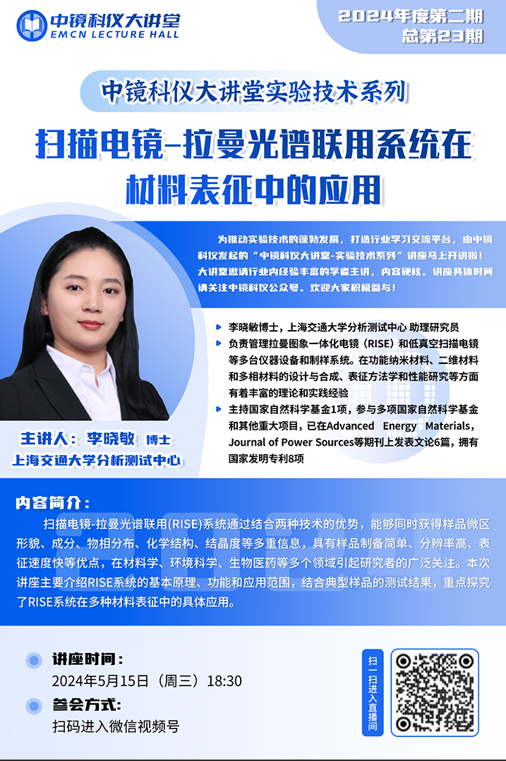 第二期:掃描電鏡-拉曼光譜聯用系統在材料表征中的應用 為推動實驗技術的蓬勃發展,打造行業學習交流的平臺,由中鏡科儀發起的2024年“中鏡科儀大講堂”第二期—“實驗技術系列”講座圓滿結束! 隨著科學技術的發展以及材料學研究的需要,基于掃描電鏡的多模塊跨尺度的聯用技術已經成為應用趨勢。本期特邀李曉敏博士為我們帶來了《掃描電鏡-拉曼光譜聯用系統在材料表征中的應用》的專題講座。講座結合具體案例,詳細介紹了RISE系統的工作原理及其在材料表征中的重要作用。內容詳實,深入淺出,精彩非凡! 現將本期講座回放發布,供大家學習,歡迎大家觀看!